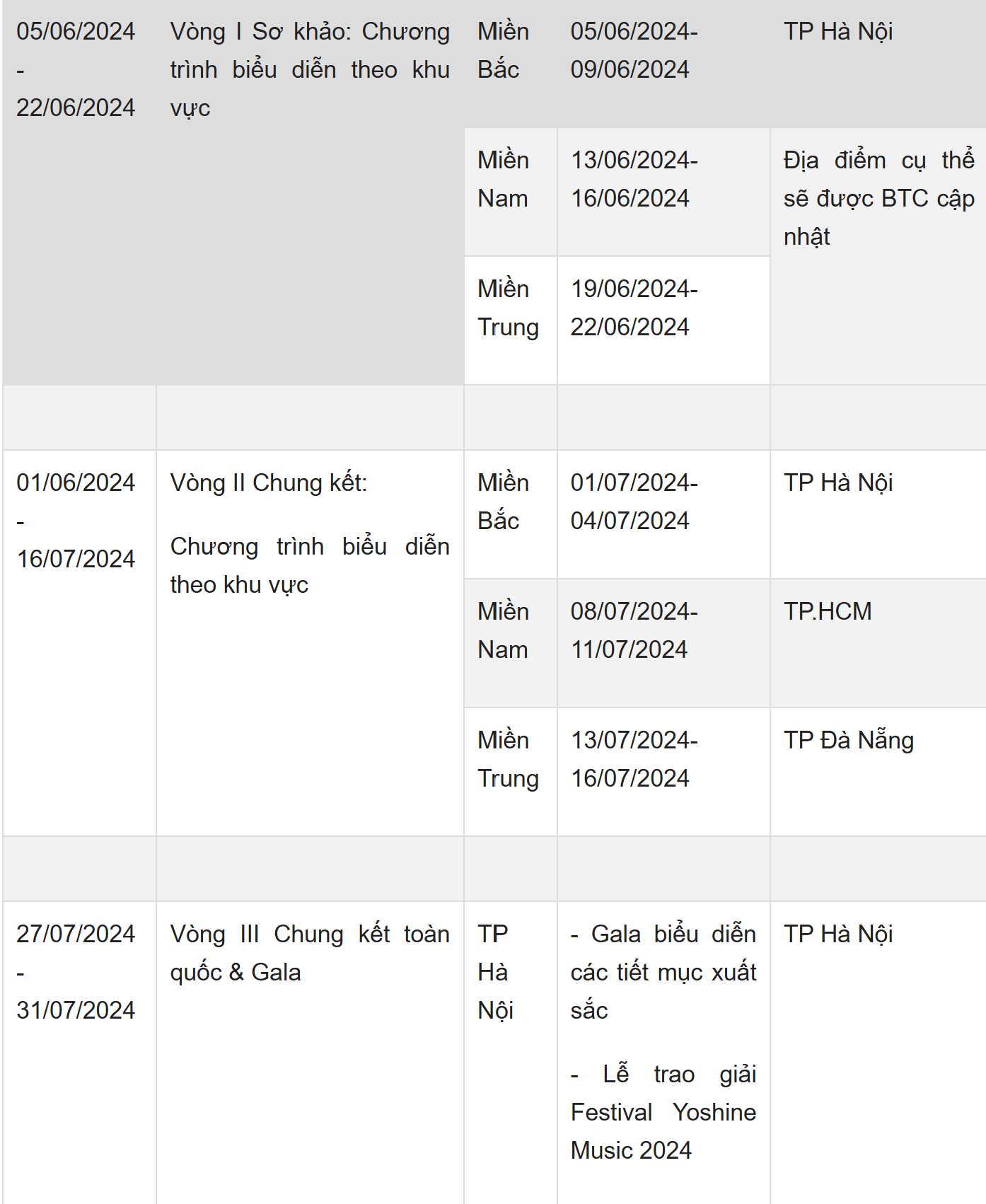 Từ ngày 13/06 - 16/07/2024, các vòng thi biểu diễn (vòng I sơ khảo theo miền, vòng II chung kết theo miền) sẽ được diễn ra, để lựa chọn các tiết mục đặc sắc nhất.